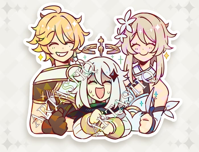 Water-proof and oil resistant stickers --- Travellers and Paimon - Glass Holo Finish || 6cm